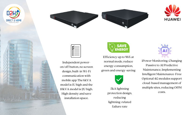 TThe FusionPower series UPS2000-H-(6-10kVA) is an ideal power supply solution for small-sized scenarios based on the online double conversion technology. It can eliminate various power grid problems and support rack or tower installation, with a high efficiency of 96%. Small size, high power density, saving installation space. In addition, no screen design and built-in Wi-Fi for communication with the mobile app, enabling flexible monitoring of the UPS status.